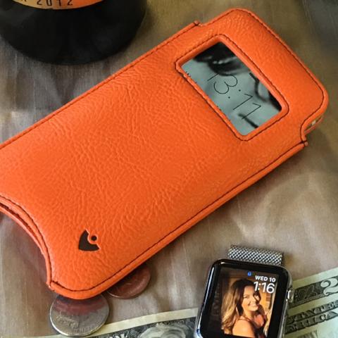 iPhone 6/6s Sleeve Case in Orange Vegan Leather | Smart Window | Screen Cleaning Sanitizing Lining
