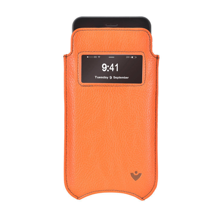 iPhone SE-2020 Pouch Case in Orange Faux Leather | Screen Cleaning and Sanitizing Lining | Smart Window