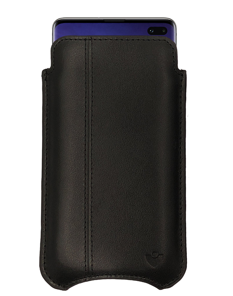 You'll love this Pirate Black genuine USA Napa leather Samsung Galaxy S10+ phone case, because it will keep your phone sanitized and every time you take your phone out of the case, the screen will be clean, looking like new.