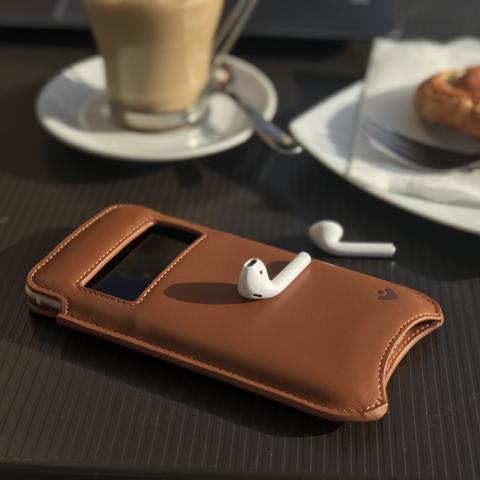 Apple iPhone 16 Pro Max Sleeve Case | Saddle Brown Leather | Screen Cleaning Sanitizing Lining | Smart Window