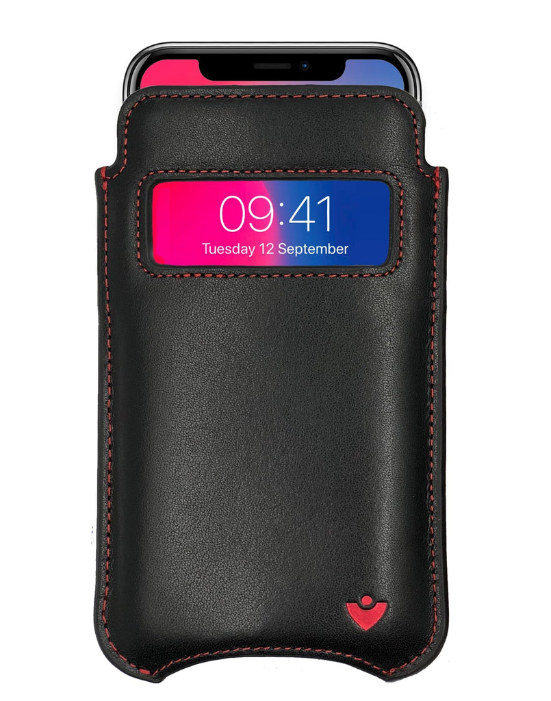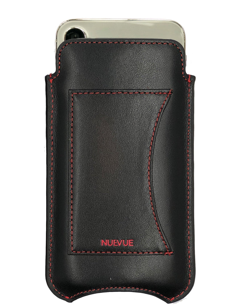iPhone 16 / 16 Pro Black/Red Leather Wallet Case with NueVue Patented Antimicrobial, Germ Fighting and Screen Cleaning Technology